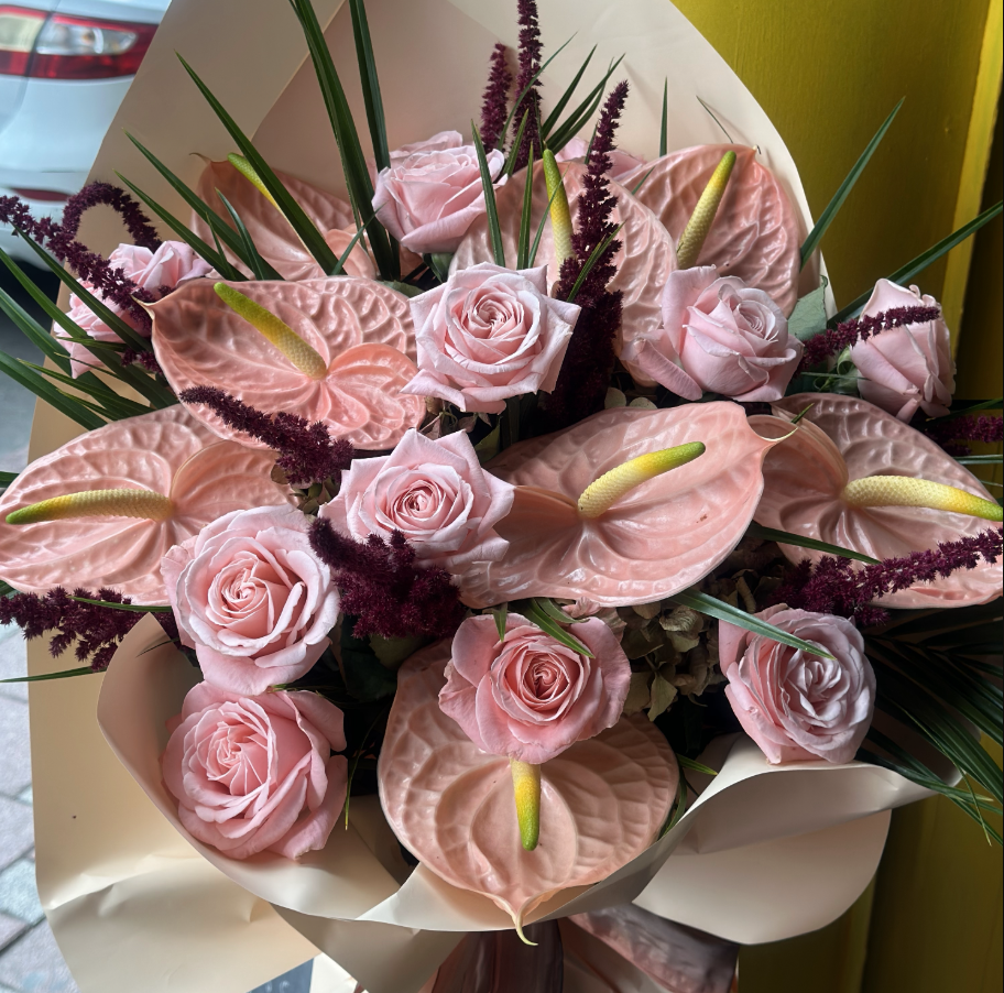 Anthurium çiçeklerinin egzotik dokusu ve pembe güllerin romantik zarafeti, bordo detaylarla bir araya gelerek etkileyici bir tasarım sunuyor. Anthurium ve Gül Zarafeti Buketi, sofistike bir görünüm arayanlar için mükemmel bir seçimdir. Pastel tonlarla modern bir dokunuş sunan bu buket, sevdiklerinize unutulmaz bir hediye vermenizi sağlar.